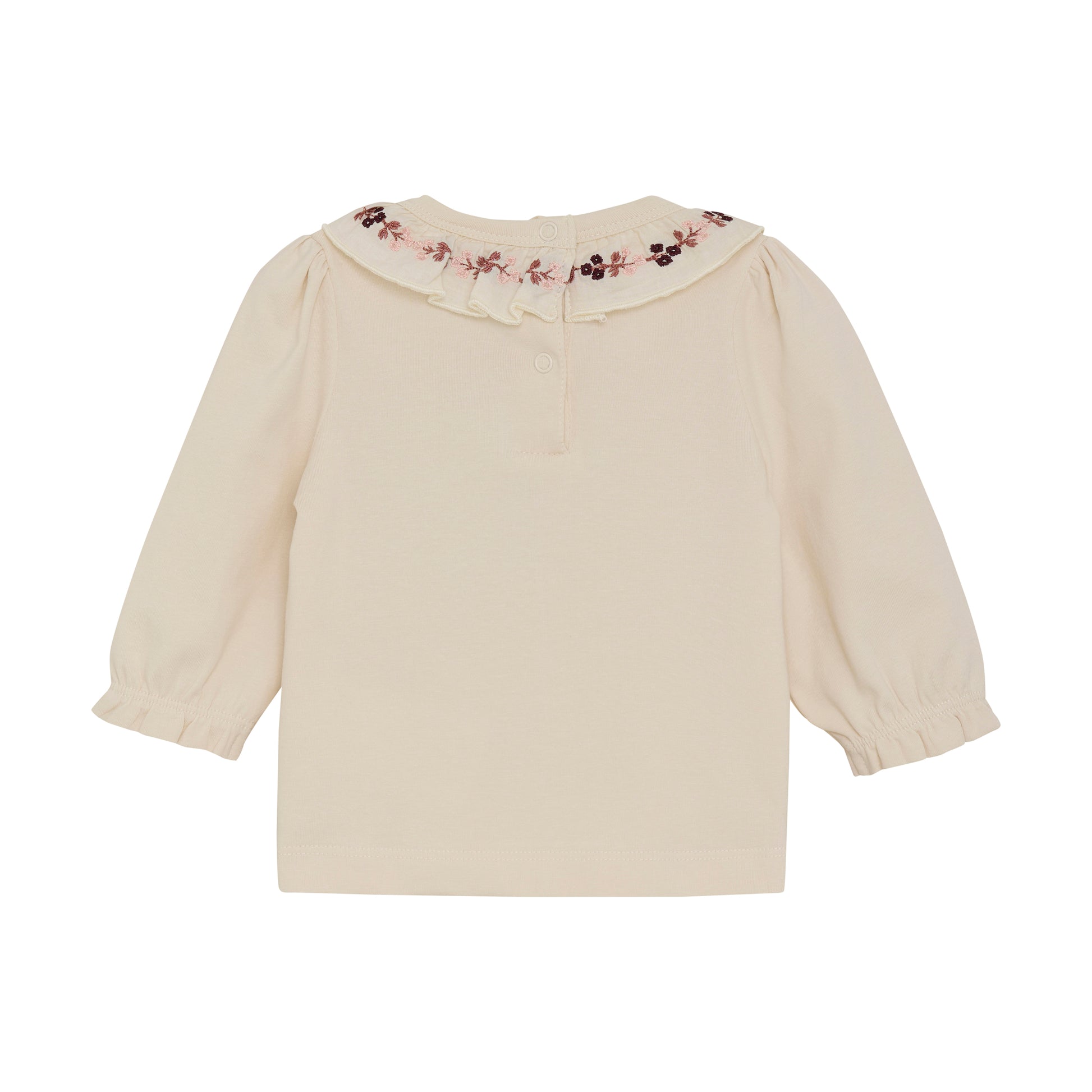 Long-sleeve T-shirt featuring a beautiful collar adorned with embroidered floral details. The T-shirt has elasticated cuffs creating delicate frills and is made from a soft and comfortable fabric.