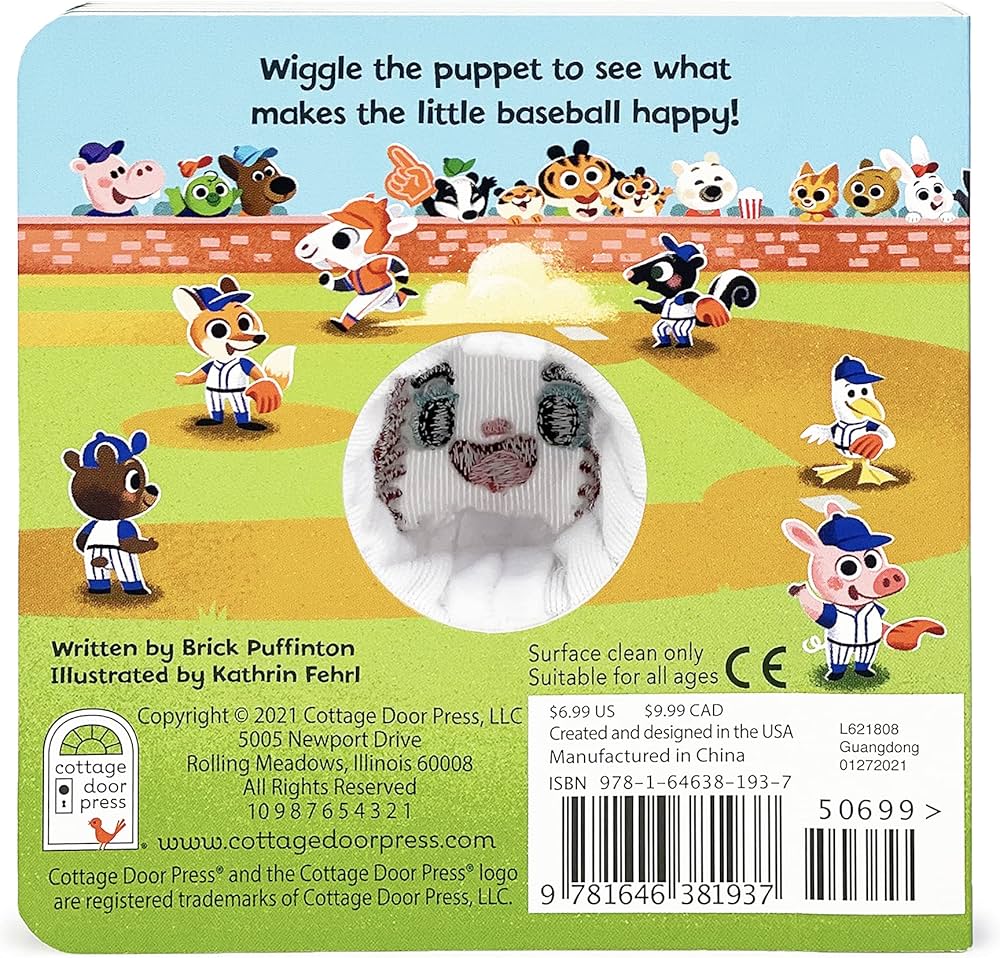 Home run! This lively, interactive finger puppet book is a home run if you're looking to introduce your little one to the great sport of baseball! Read or sing along to Take Me Out to the Ball Game, wiggle the cute baseball puppet around, and tour the field. Boys and girls alike will love exploring every playful scene filled with animal friends and tons of baseball fun, while practicing early learning concepts like counting and language patterns. This story features a fun baseball finger puppet toy built into the board book encouraging interactive play, hand-eye coordination, and sensory and language development. Babies and toddlers learn best when they are playing, especially when their grown-ups are in on the fun. A perfect first baseball book for your budding little athlete!