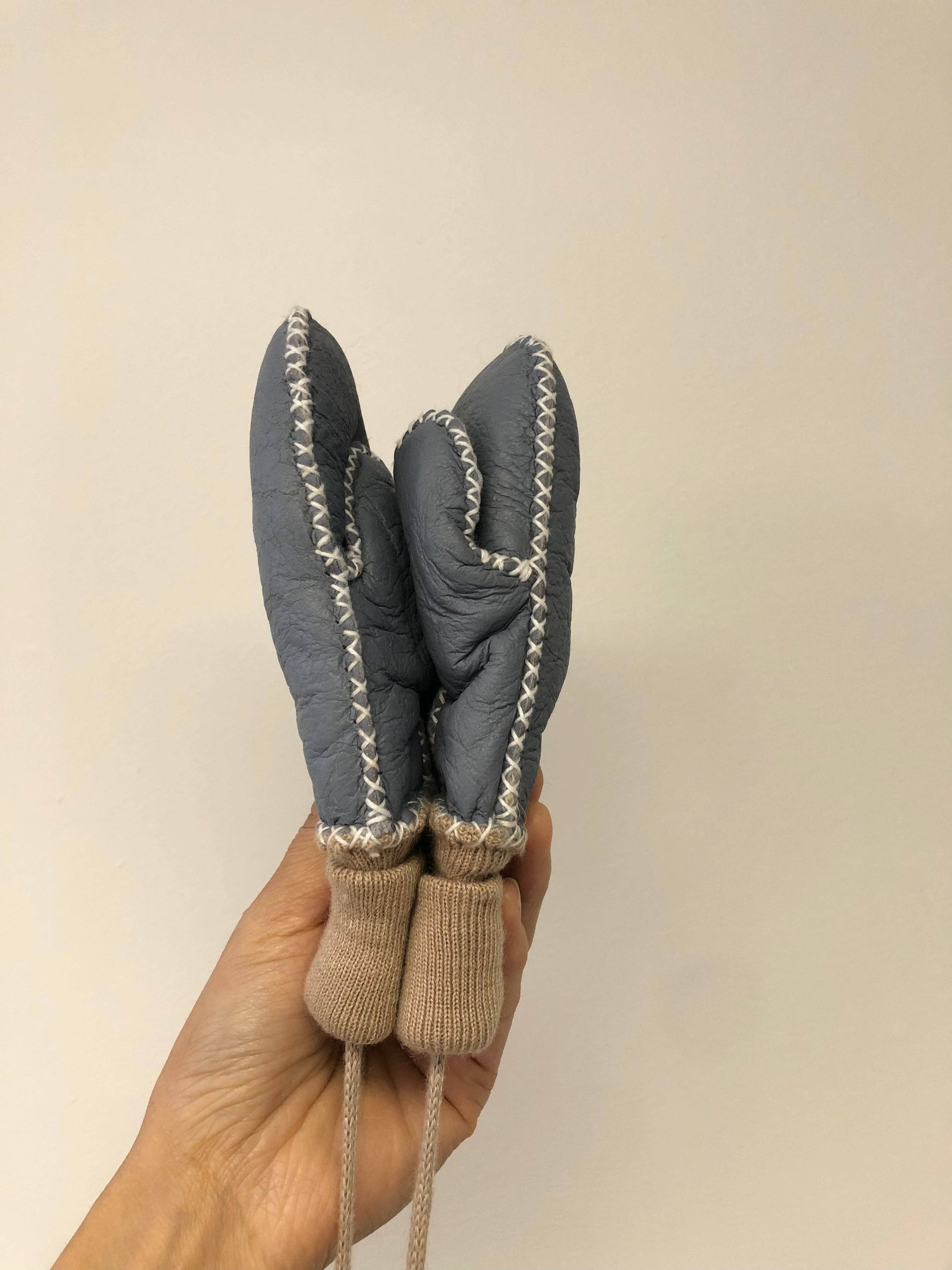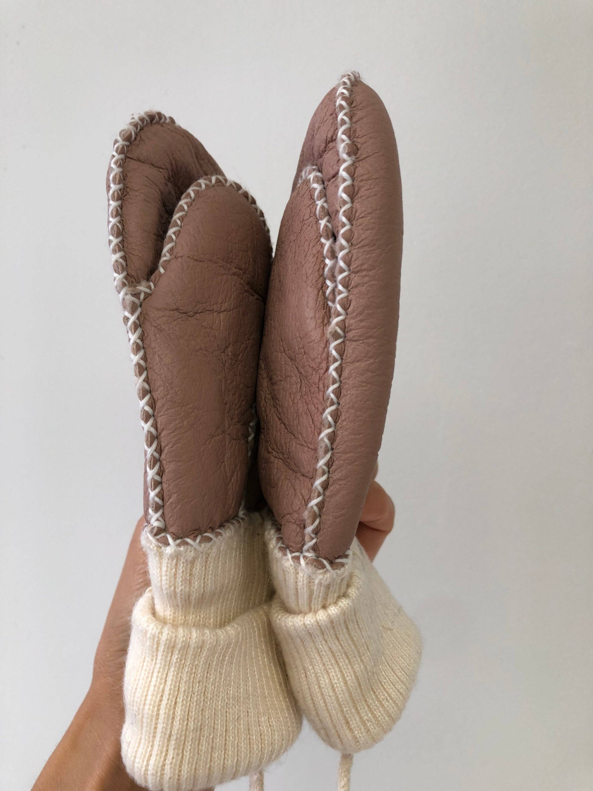 Real sheep skin, soft leather outside, cozy fur inside, hand stitched, a string attached both mittens together, easy for little kids to carry around.