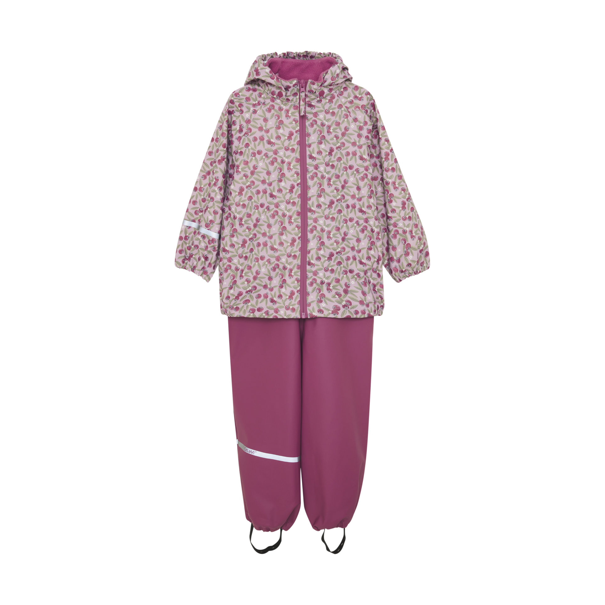The set consists of a jacket with an all-over print and a solid-colored bottom. The trousers have adjustable suspenders and click buckles up to size 5y, after which they come without suspenders. The trousers have practical and adjustable elastic straps that can be pulled under the footwear. The jacket closes with a waterproff zipper. There are narrow reflective stripes around one arm and one leg. At the top of one arm and on the back of the hood, the logo is printed with a reflective finish. The CeLaVi rain jacket has a detachable hood that is fastened with snap buttons. The hood opening, sleeves, and waist have elastic for a better fit. The set has a water column pressure of 10,000 mm.