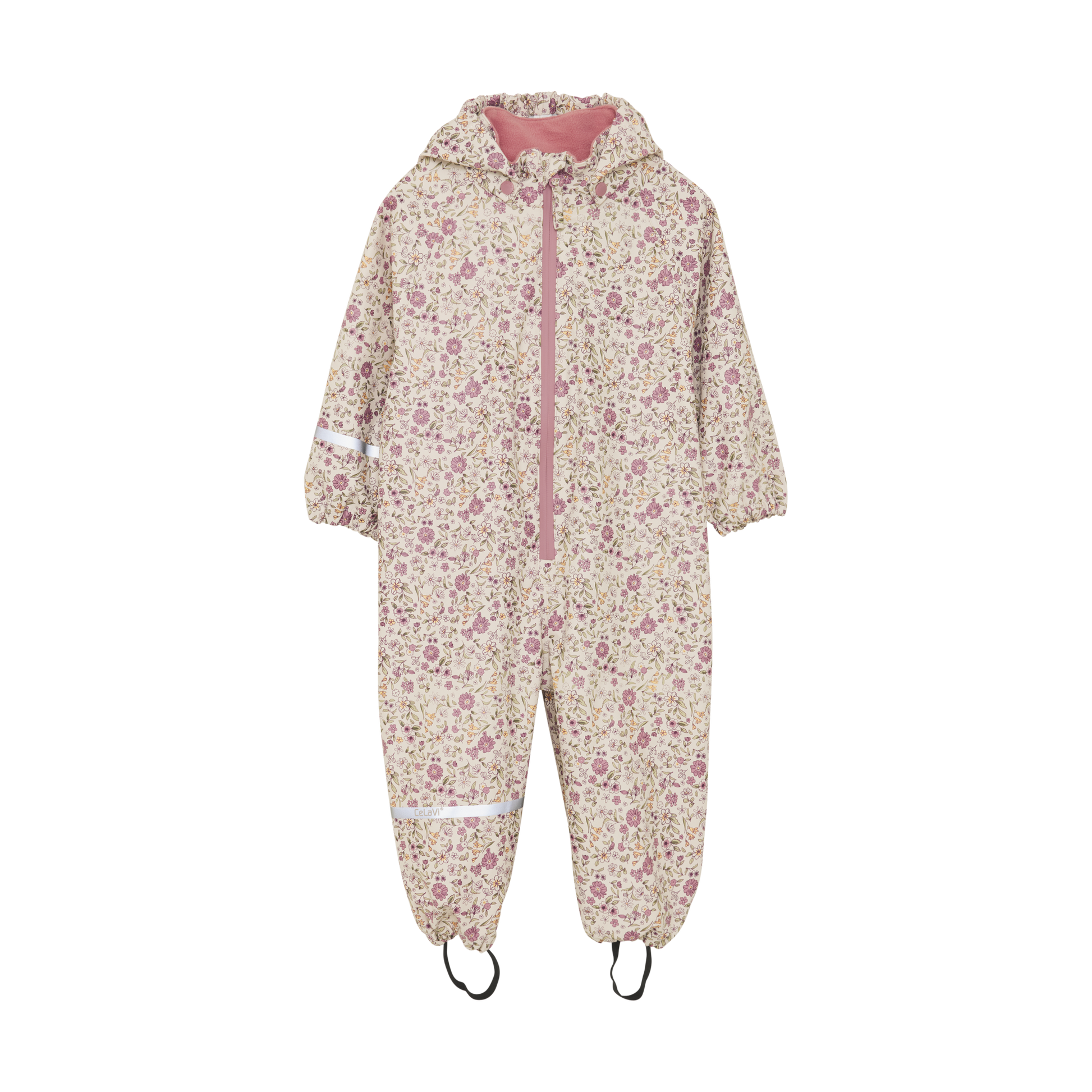 Rain suit in PU from CeLaVi. The rain suit has an allover print. There are narrow reflective stripes around one arm and one leg. At the top of one arm and on the back of the hood, the logo is printed with a reflective finish. The CeLaVi rain suit has a detachable hood that is fastened with snap buttons at the collar. It closes in the front with a waterproof zipper. The hood opening, sleeves, and waist have elastic for a better fit. The trousers have practical and adjustable elastic straps that can be pulled under the footwear. The rain suit has a water column pressure of 10,000 mm. Certified acc. to GRS - Made with 66% Recycled Material CERES-0366