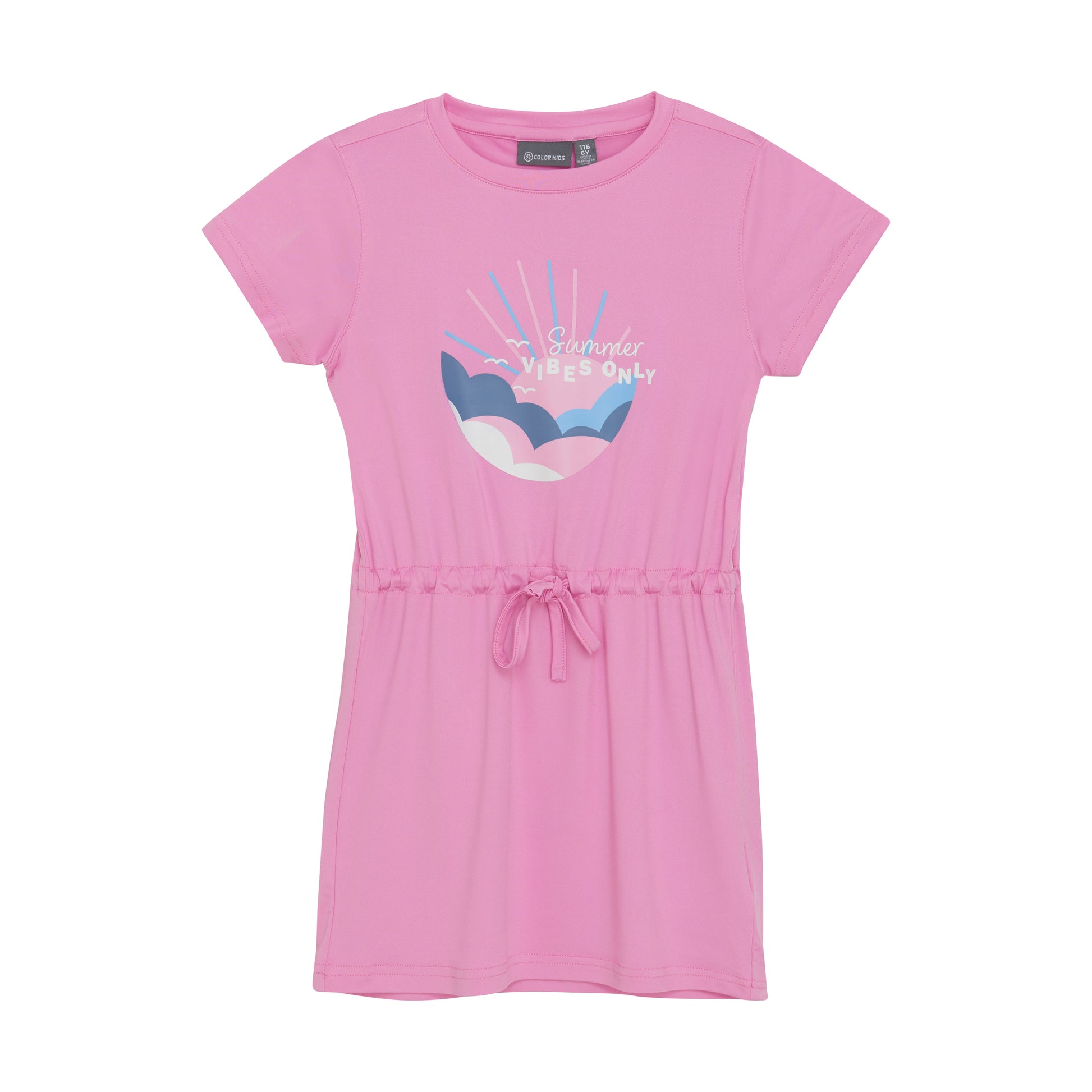 Nice dress with front print, with more features that makes it sporty. The dress has short sleeves, ties around the waist and is made of quick drying and breathable fabric with a lot of stretch. Wearable over swimwear on a trip to the beach.