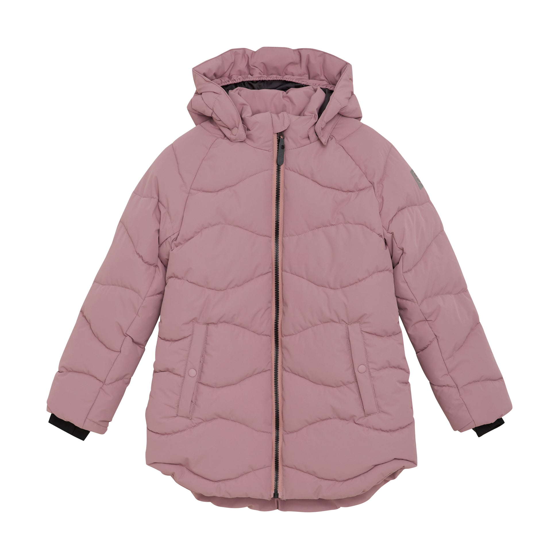 Warm long quilted snowjacket for your child in durable material. The material is breathable, windproof and waterproof, so your child can stay out in the rain, snow and wind without getting cold and wet. Tested wear resistance of 20.000 rubs, water column pressure of 8,000 mm. and breathability of 3,000g.The jacket closes with a quality zipper at the front. Good inside wind pole. Chin protectors make sure that the zipper feels soft under the chin. The jacket has detachable hood and outside zip pockets. Reflective details on the back of the jacket and on the sleeve. Inner cuffs with hole for thumb. It has a name tag inside. The snowjacket is made of recycled material. Coated with BIONIC FINISH® ECO. Certified acc. to GRS - Made with more than 50% Recycled Material