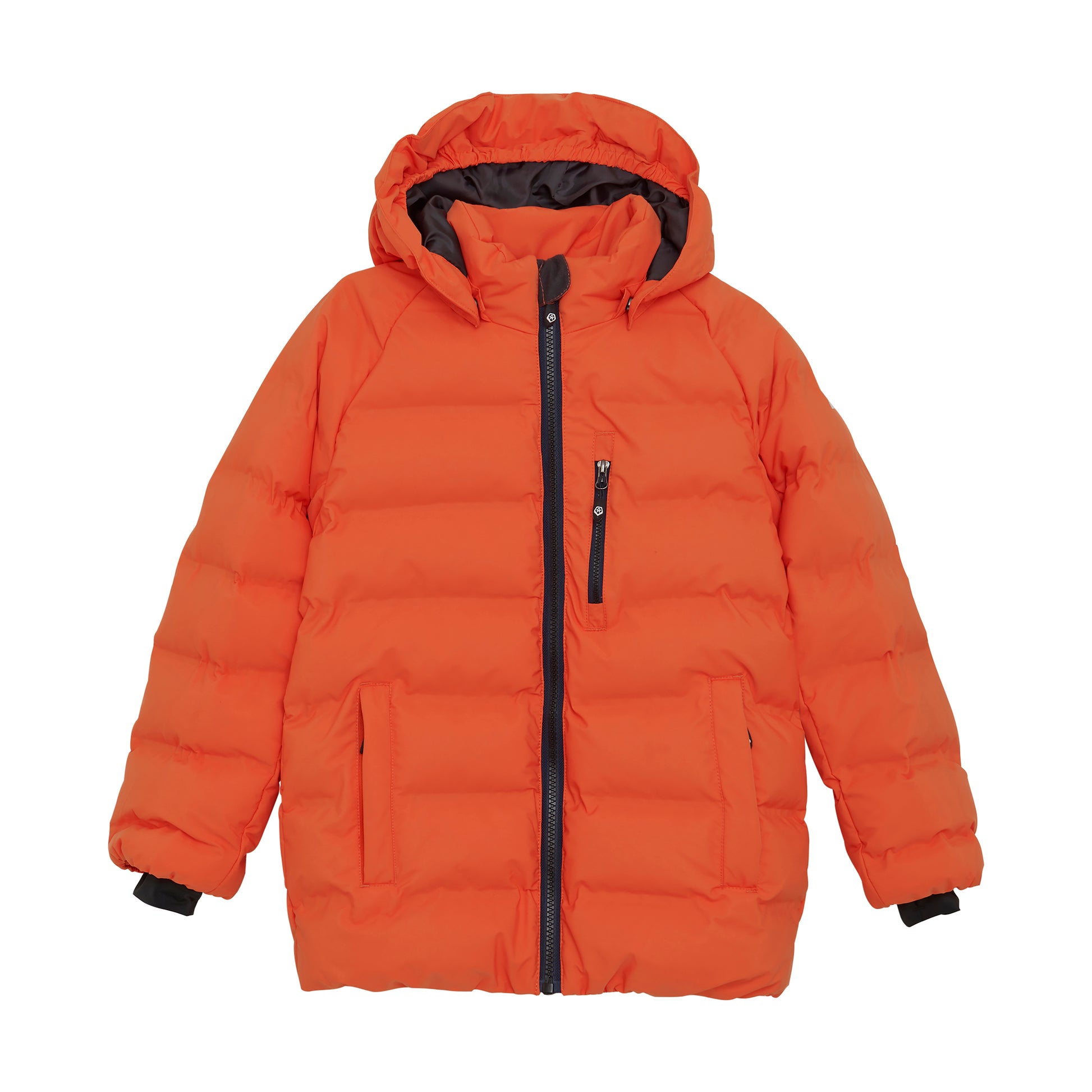 Long and warm quilted winter jacket in durable and partially recycled material. The material is breathable, windproof and waterproof, so your child can be out in rain, snow and wind without getting cold and wet. Tested wear resistance of 20,000 rubs, water column pressure of 8,000 mm. and breathability of 3,000g. The jacket closes with a quality zip at the front and has two external pockets. The chin guard ensures that the zipper feels soft under the chin. The jacket has inner cuffs with space for the thumb. Reflective details on the back and on the sleeve for increased visibility. With name tag inside for easy identification. Certified acc. to GRS - Made with more than 50% Recycled Material CERES-0366