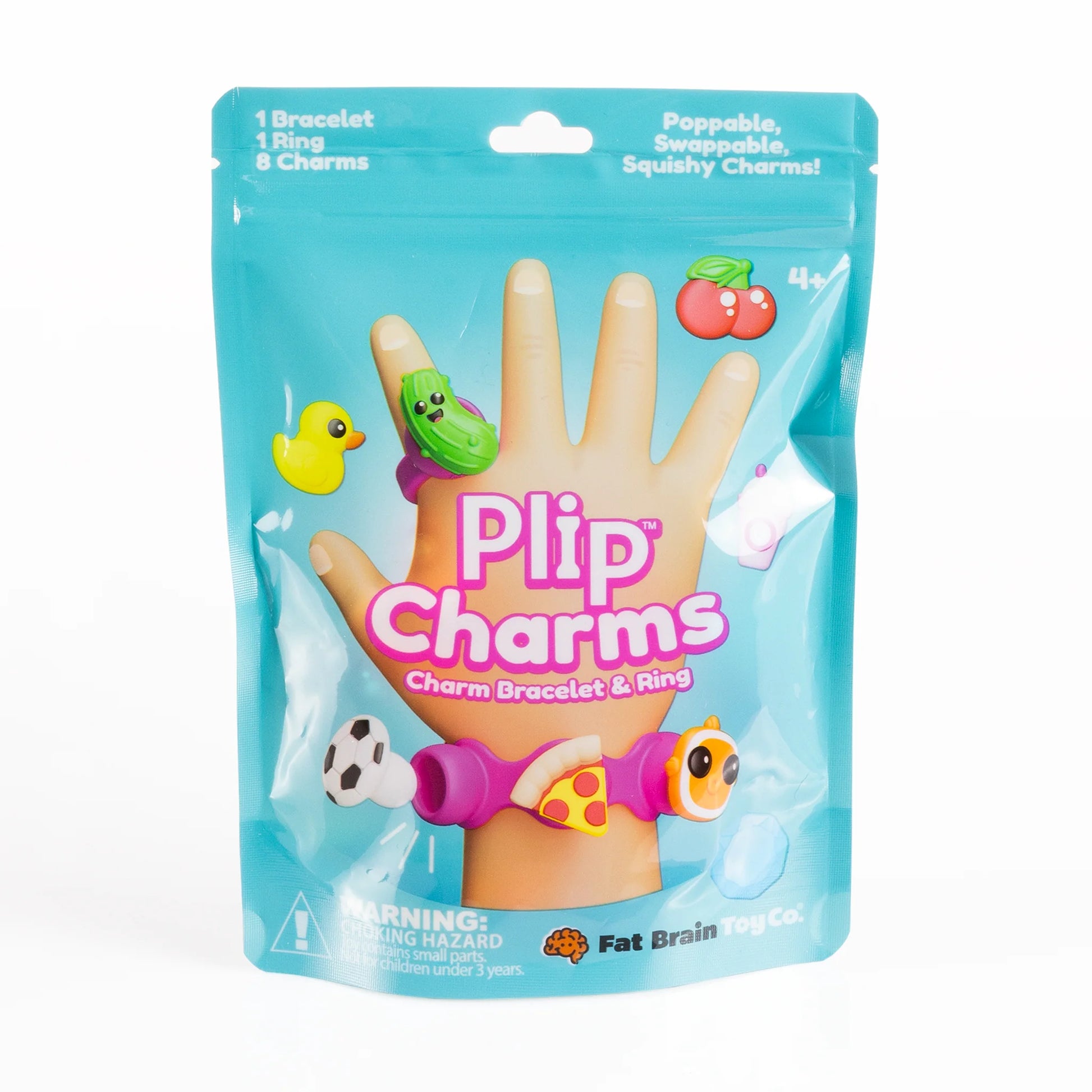 Pick your favorite charms and fit them into the sockets of the silicone bracelet and ring. It's a playful way to accessorize - on your wrists and fingers or even on a backpack - and when you pull them out, they make the most satisfying "POP!" Each set comes with a bracelet, a ring, and eight unique charms. Collect them all. Trade them with your friends. Let your personality POP with Plip Charms!