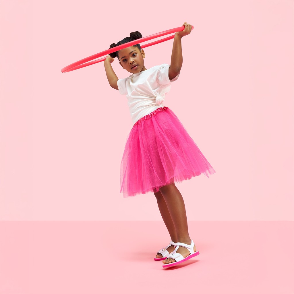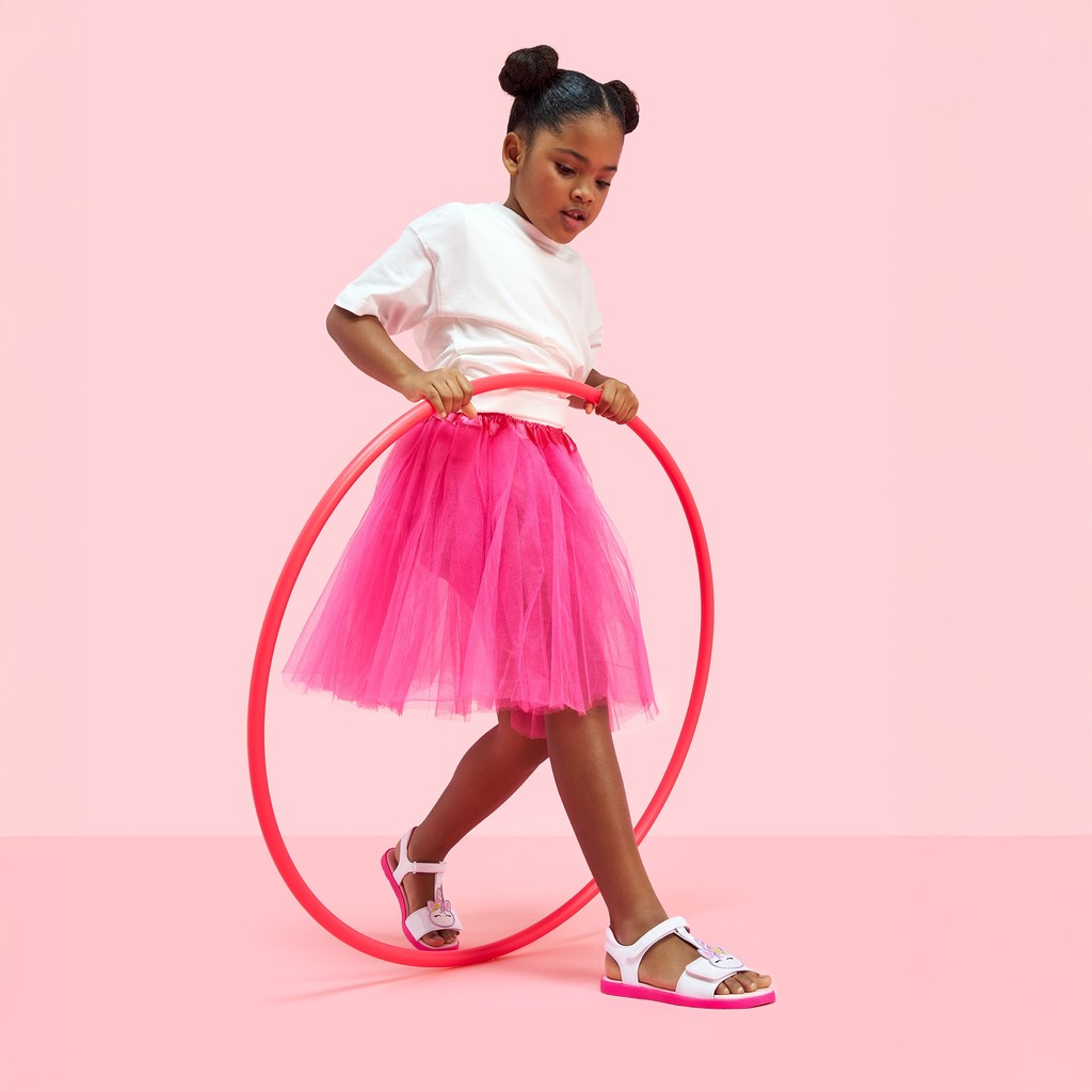 Flexible and breathable girls' sandals with a playful and feminine design. In this white and fluorescent fuchsia version, they are made of patent-effect material with a cheerful unicorn-shaped patch sewn onto the upper. Adjustable with straps to ensure optimal support, Joyfoot complements everyday looks, offering unique style and maximum comfort.