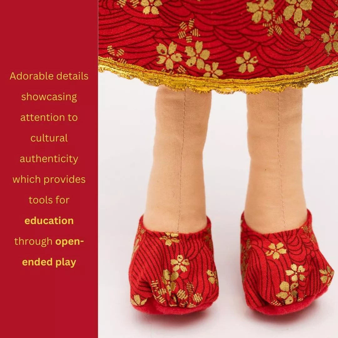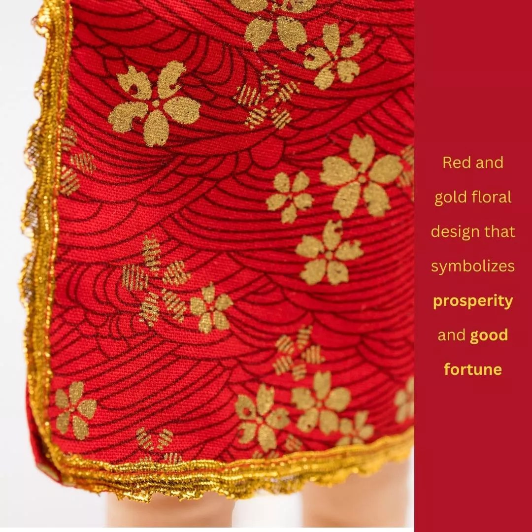 Introducing the “Mei” Chinese Doll from Joeydolls, a stunning and authentic representation of Chinese culture and tradition. Dressed in a vibrant red and gold Cheongsam/Qipao, this doll perfectly embodies good fortune, joy, wealth, and prosperity. Our “Mei” Chinese Doll wears a beautiful dress adorned with intricate gold accents that shimmer in the light. Her matching floral hair accessories and red and gold shoes complete her elegant ensemble.