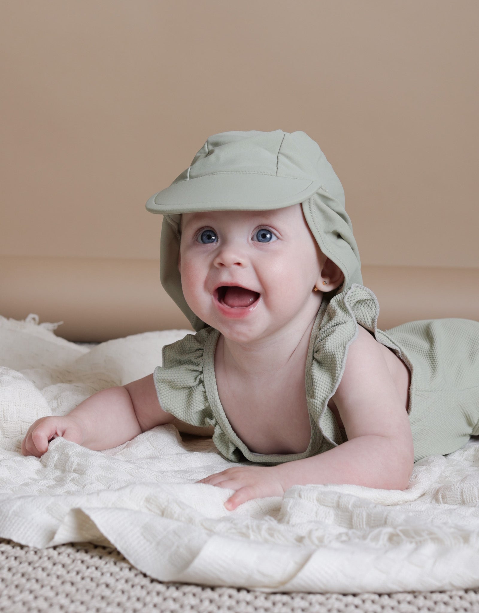 This adorable swimsuit boasts a playful ruffle design around the shoulders, making it perfect for a day of fun in the sun.