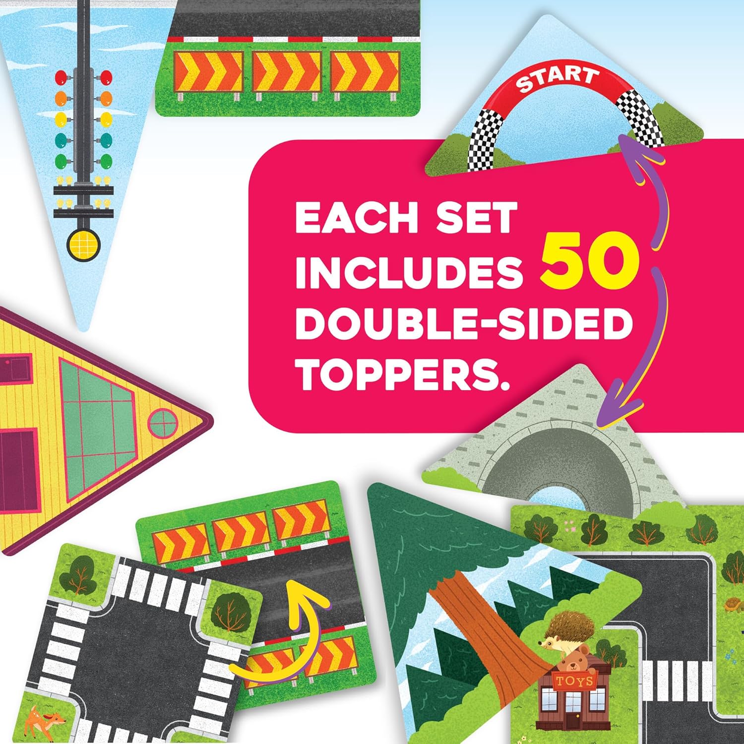 Zoom into playtime with a fresh, engaging twist on magnetic construction! Our Flip Formers Roads tile toppers turn any magnetic play set into a bustling city, or flip the sheets over to design a thrilling racetrack. With 50 two-sided pieces in the set, kids can fuel their imaginations and create dynamic scenes for their toy cars and magnetic tiles. These sheets amplify the fun and drive creativity into the fast lane, ensuring your magnetic tile set is the pit stop for every creative journey! Magnetic tiles not included.