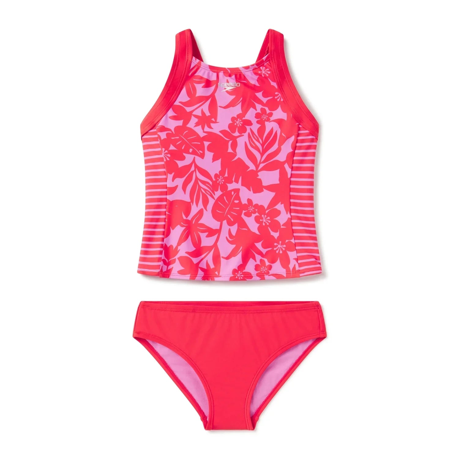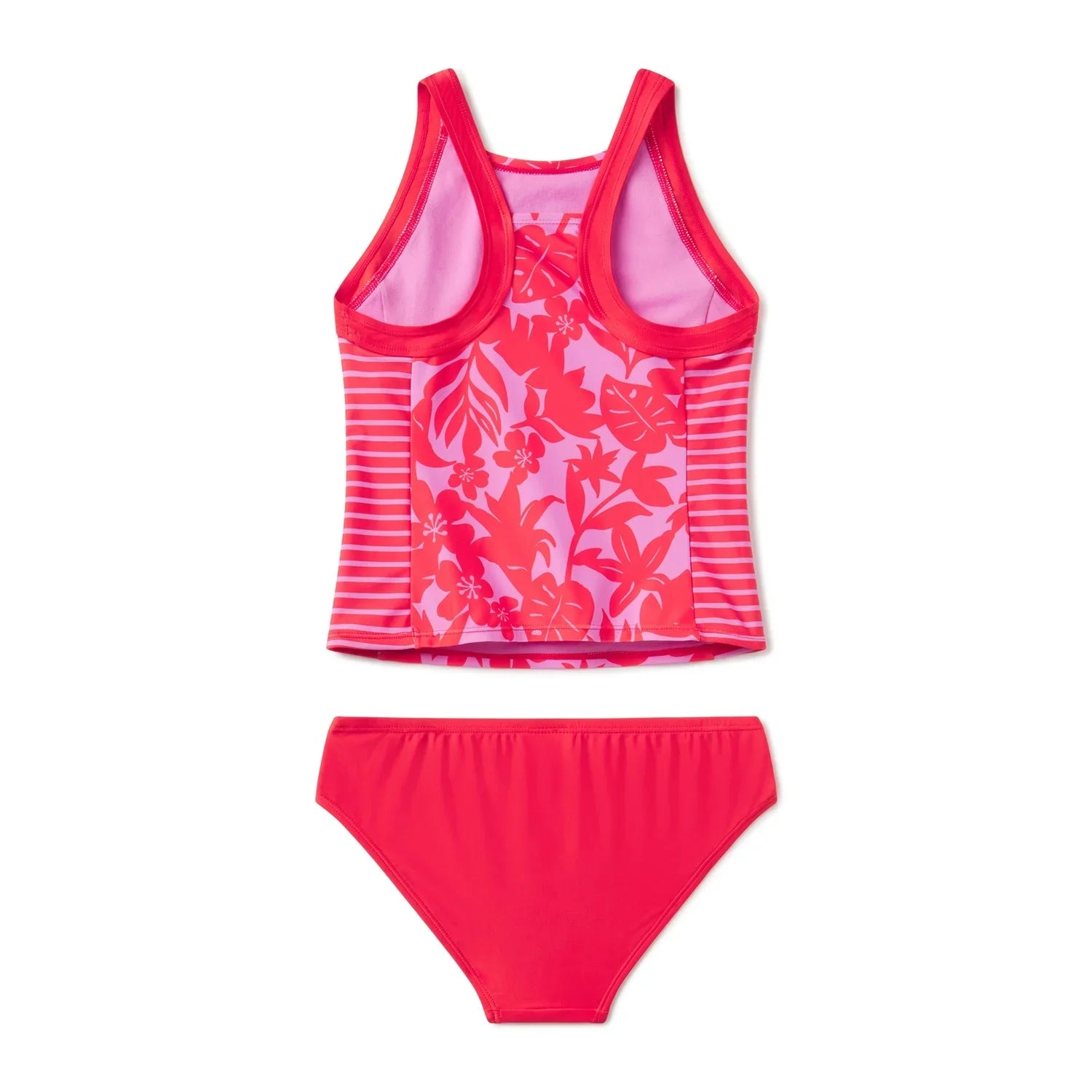 She'll love swimming in this durable two-piece set, featuring a printed full coverage top with built-in sun protection with Block the Burn UV 50+. A solid bottom completes the sporty look and makes mixing and matching easy..