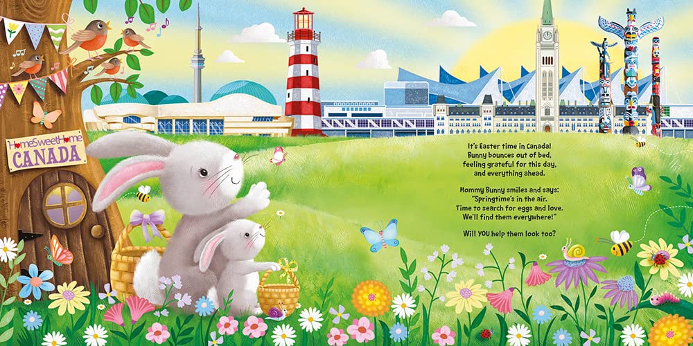 - An engaging story for boys and girls ages 3-7 that combines local Canada sites with a celebration of family and Easter blessings - Includeshidden eggs on every page so toddlers and kids can join in on Little Bunny's egg hunt - A perfect Easter gift to celebrate the holiday and start a fun new tradition! - Enjoy landmarks such as Parliament Building, Canadian Museum of Natural History, Stanley Park Totem Pole, and more - Perfect for kids who live in or have relatives in Canada or visit the North Withone egg in the basket,