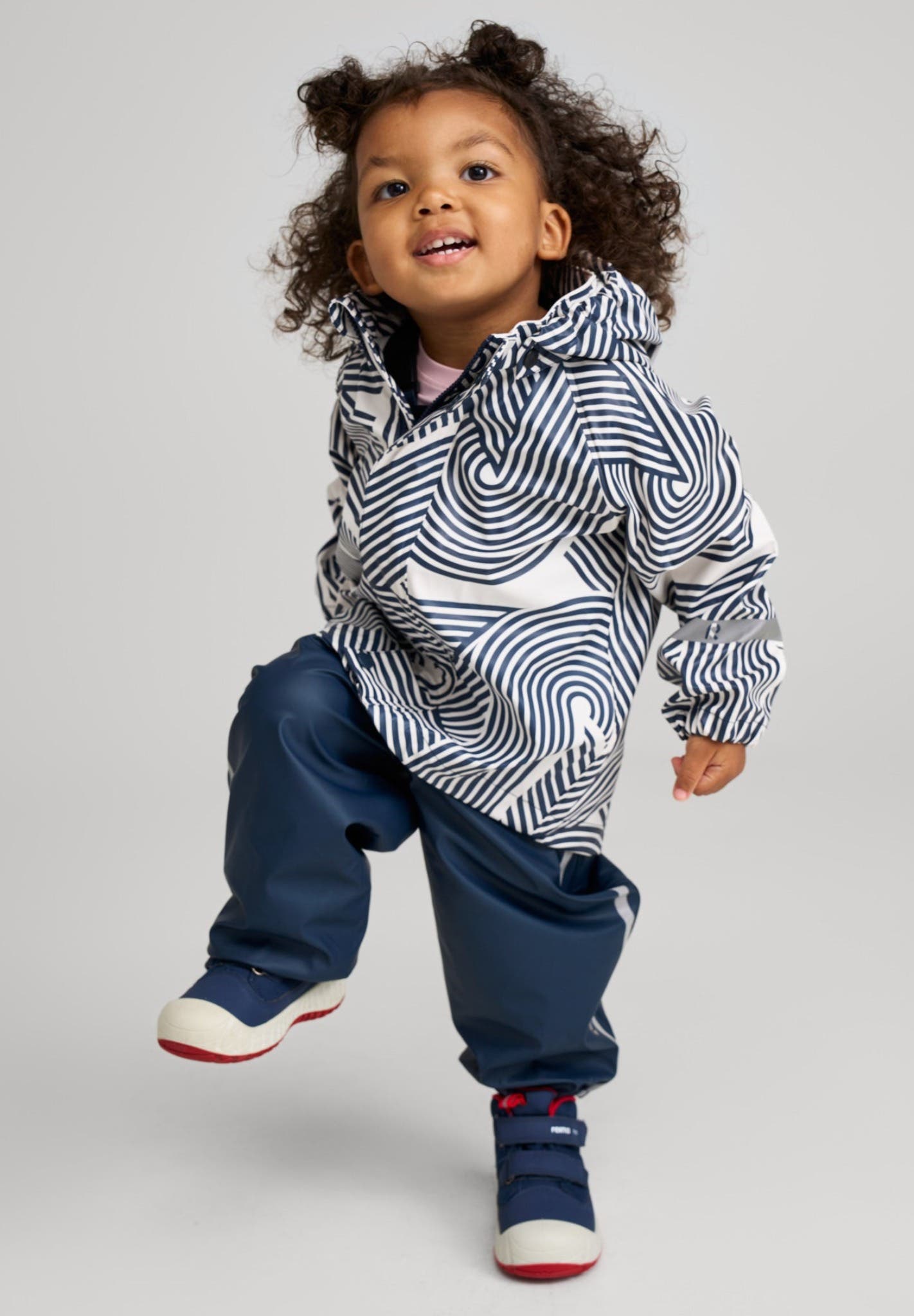 - Removable, molded EVA insoles with jersey lining and Happy Fit print help to find the correct size