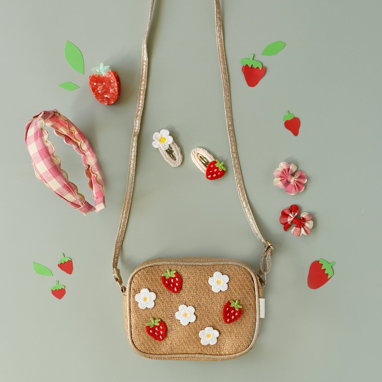 This strawberry fields bag is perfect for little nature lovers. Made from a soft raffia and embroidered with sweet strawberries and little daisies, it features a zip opening and adjustable gold strap with breakpoint for safety. The perfect bag for summer picnics!