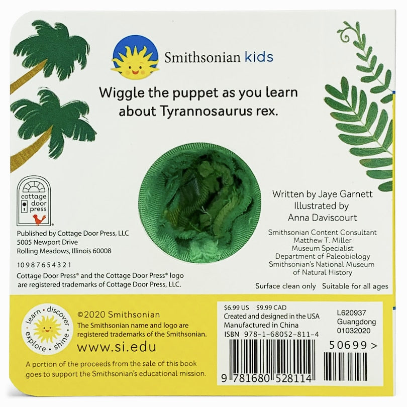 Let's play with our Tyrannosaurus Rex friend! Learn all about the king of the dinosaurs that roamed North America more than 65 million years ago. This story features a fun finger puppet toy built into the board book encouraging interactive play, hand-eye coordination, and sensory and language development. Babies and toddlers learn best when they are playing, especially when their grown-ups are in on the fun! A perfect dinosaur introductionfor littles stacked with fun dino facts.