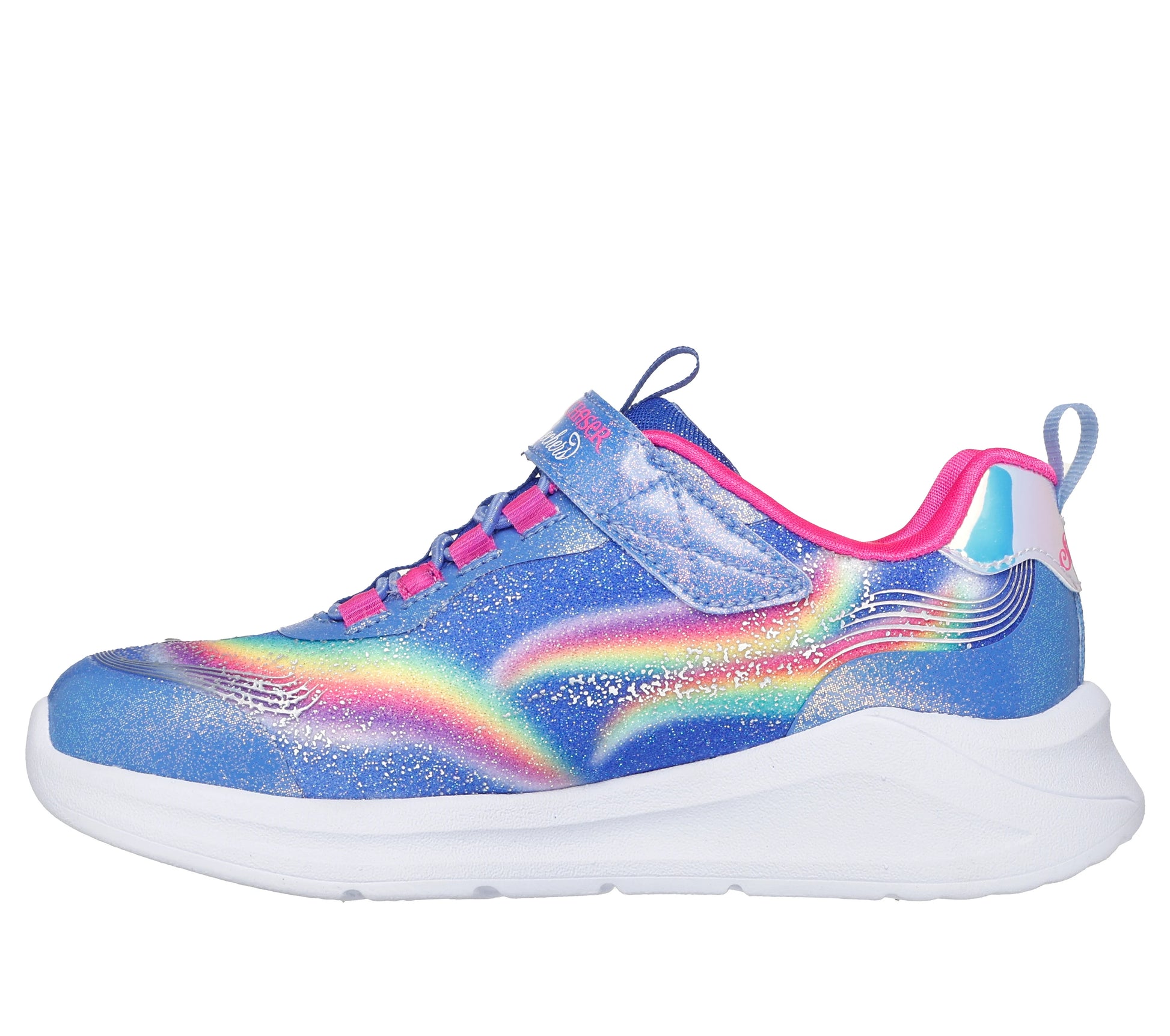 Sparkle and shine in style wearing Skechers S-Lights® Unicorn Chaser. This sporty Magical Collection® lighted design features a synthetic glitter finish upper with unicorn and rainbow side graphic, stretch laces, adjustable instep strap, and a cushioned comfort footbed.
