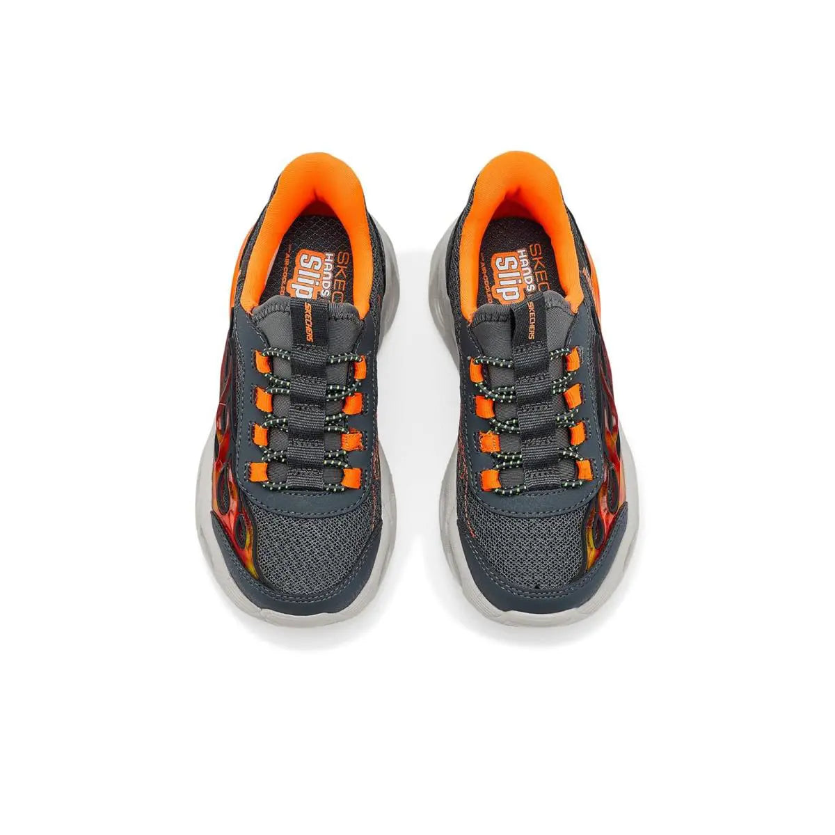 Fan the flames of fun with every cushioned step in Skechers Hands Free Slip-ins® S-Lights®: Thermo-Flash 2.0 - Heat-Brisk. Designed with our Heel Pillow®, this thematic slip-on features an athletic mesh and synthetic upper, stretch laces, and a sculpted midsole with a light-up "flames" tech piece.