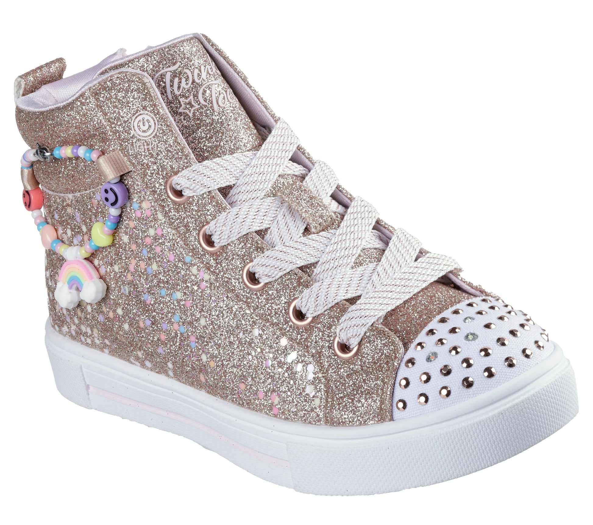 Brighten your steps in magical style with Skechers Twinkle Toes®: Twinkle Sparks - Charm Bestie. This high-top lace-up features a glittery synthetic upper with side zip closure, 2 detachable friendship bracelets, and a light-up rihinestone toe cap.